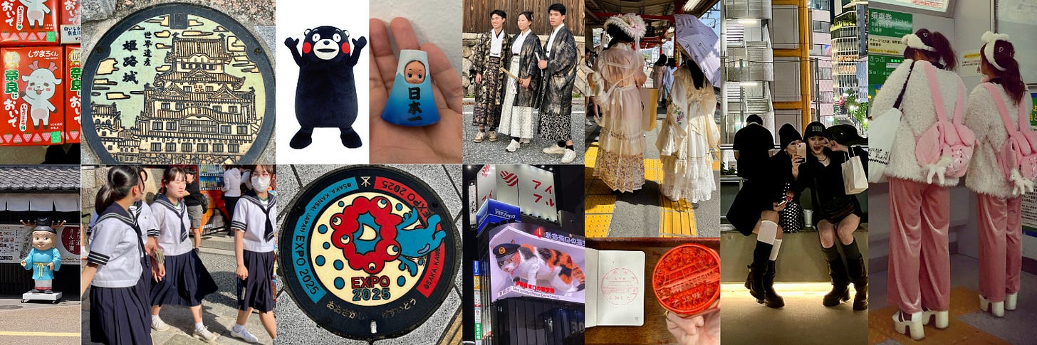 Città, luoghi simbolo, eventi, distretti, prefetture (l’equivalente delle nostre “regioni”) scelgono di personalizzare la propria immagine con grande attenzione, “brandizzandola” per celebrare l’orgoglio locale. Così ci siamo trovati a fotografare alcuni delle migliaia (dicono 12.000) di tombini artistici in ghisa detti manhoru che dal 1975 con l’Expo di Okinawa richiamano nei loro dipinti tradizioni, simboli o personaggi locali, compresi anche quelli dei fumetti. Ci sono poi le tante mascotte pop, dette yuru-chara (traducibile in personaggio morbido/goffo) che sono spesso vere star e gadget amatissimi, come l’orso nero dalle guance rosse Kumamon. Famosissimi anche i timbri Eki Stamp che potete ottenere visitando stazioni, monumenti, templi e molte altre attrazioni, per collezionarli.